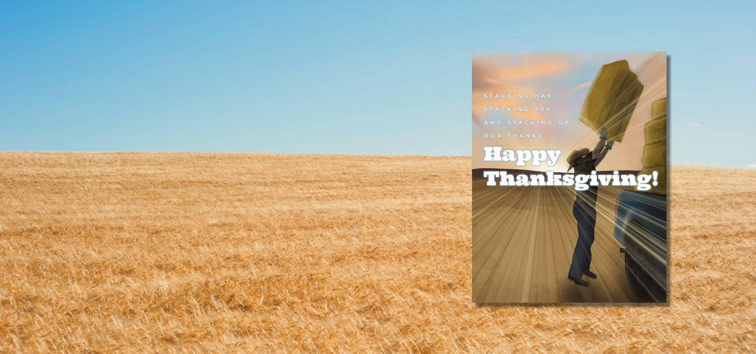 Send love and cheerful tiding. This beautiful Thanksgiving greeting card features a hardworking rancher stacking his hay bales, awash with fall colors and a heartfelt message of gratitude. Stacking joy and never-ending thanks!
