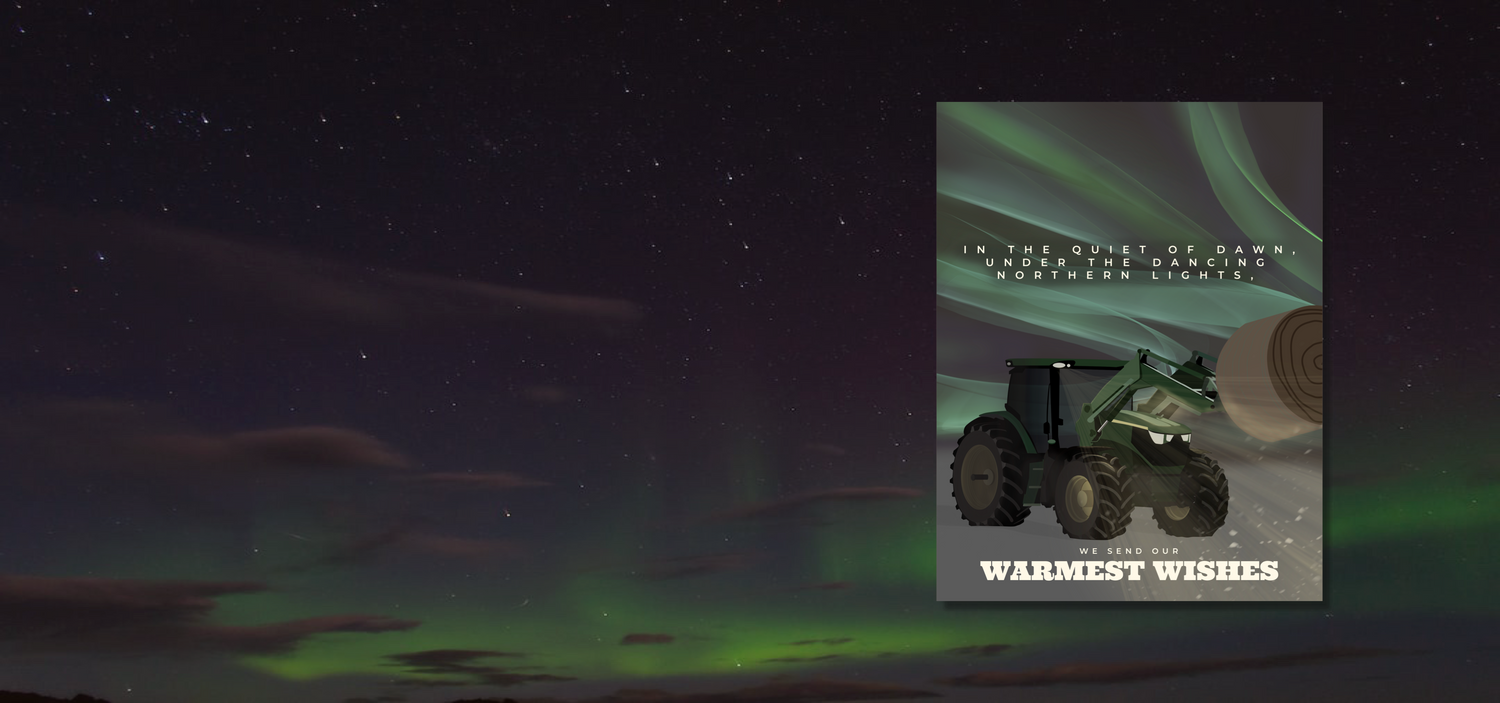 Experience the beauty of Christmas morning with Warmest Morning Wishes. Journey to the heart of the countryside, with a rancher out feeding cattle as the northern lights dance in the sky. Feel the warmth and comfort of his tractor, and send your own warmest wishes to your loved ones.
