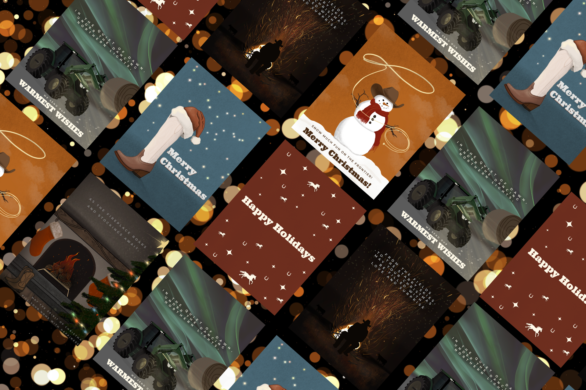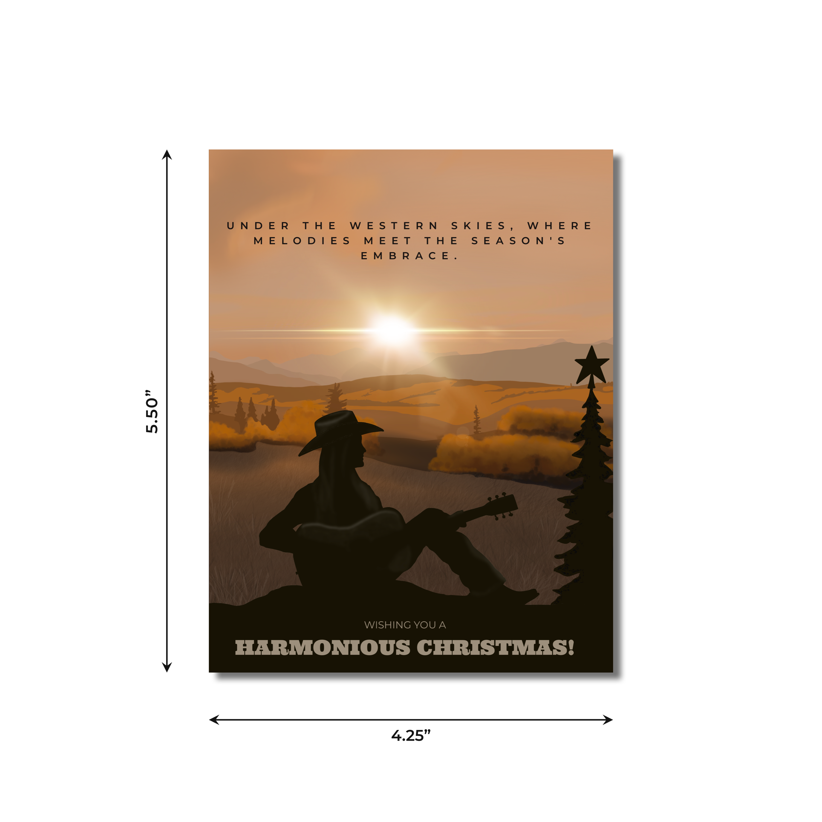 Celebrate the Christmas spirit with this festive greeting card! Under the western skies, feel the romantic melodies as the season's embrace wraps you up in a cozy blanket of harmony. Let the girl playing her acoustic guitar on a hillside take you away to a happy place this holiday! Harmonious Christmas – may your Christmas be merry!