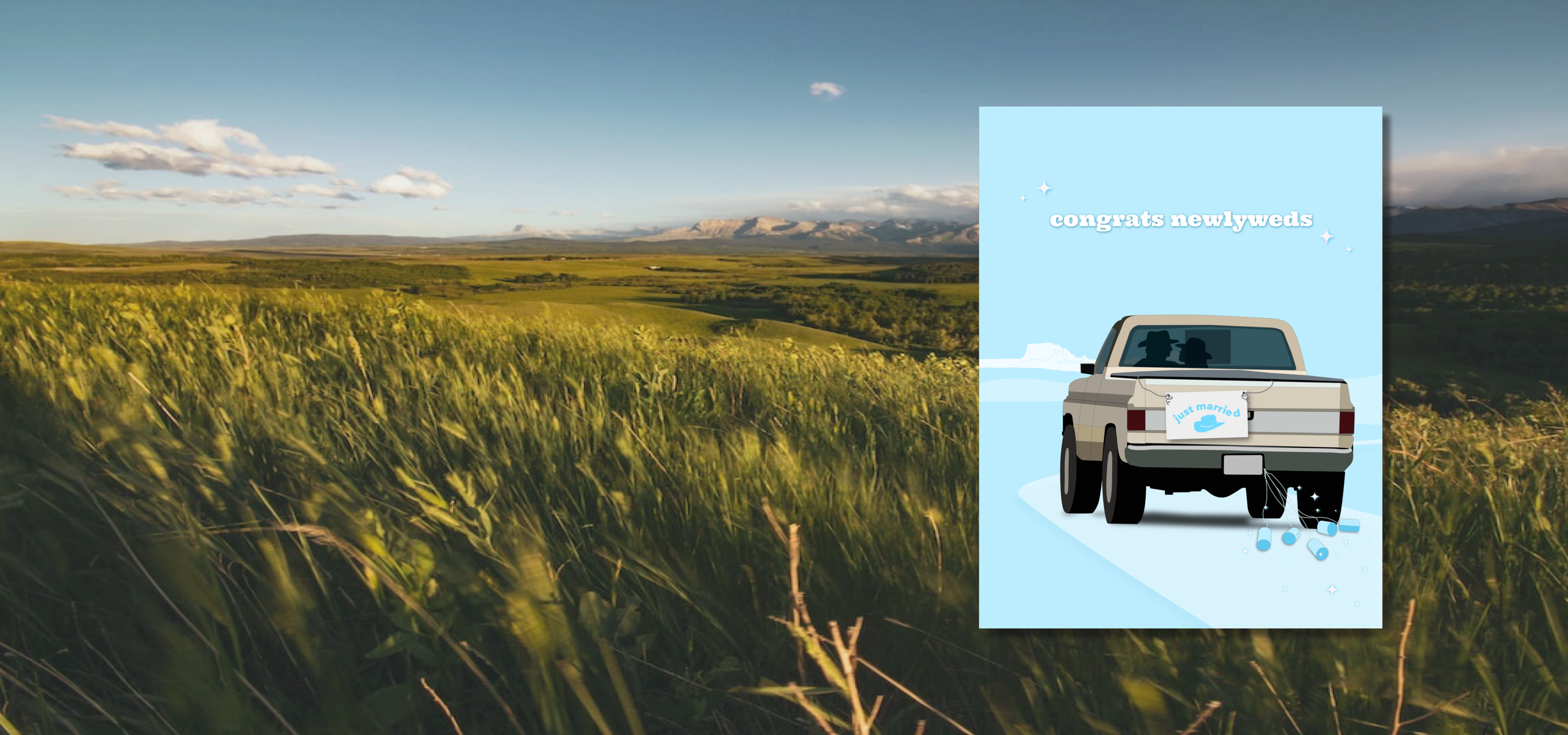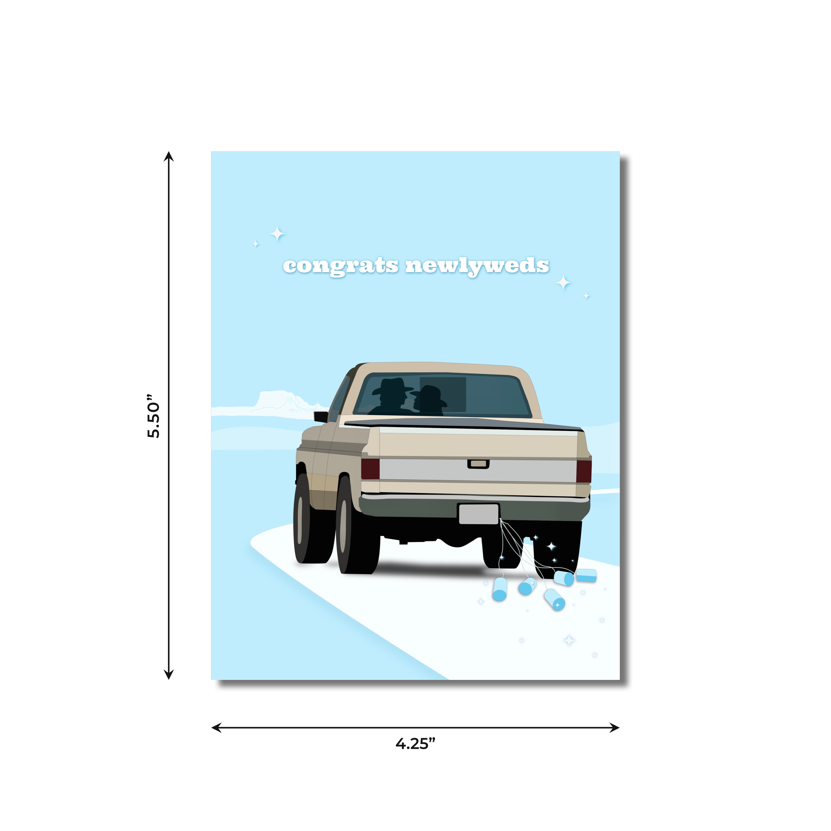Celebrate the happy couple's big day with this fun Congrats Newly Weds card! Featuring a truck driving down a gravel road, cans rattling from the back to show they Just Got Married, it's sure to make them chuckle! So hit the gas and send your well wishes to make their special day even better.